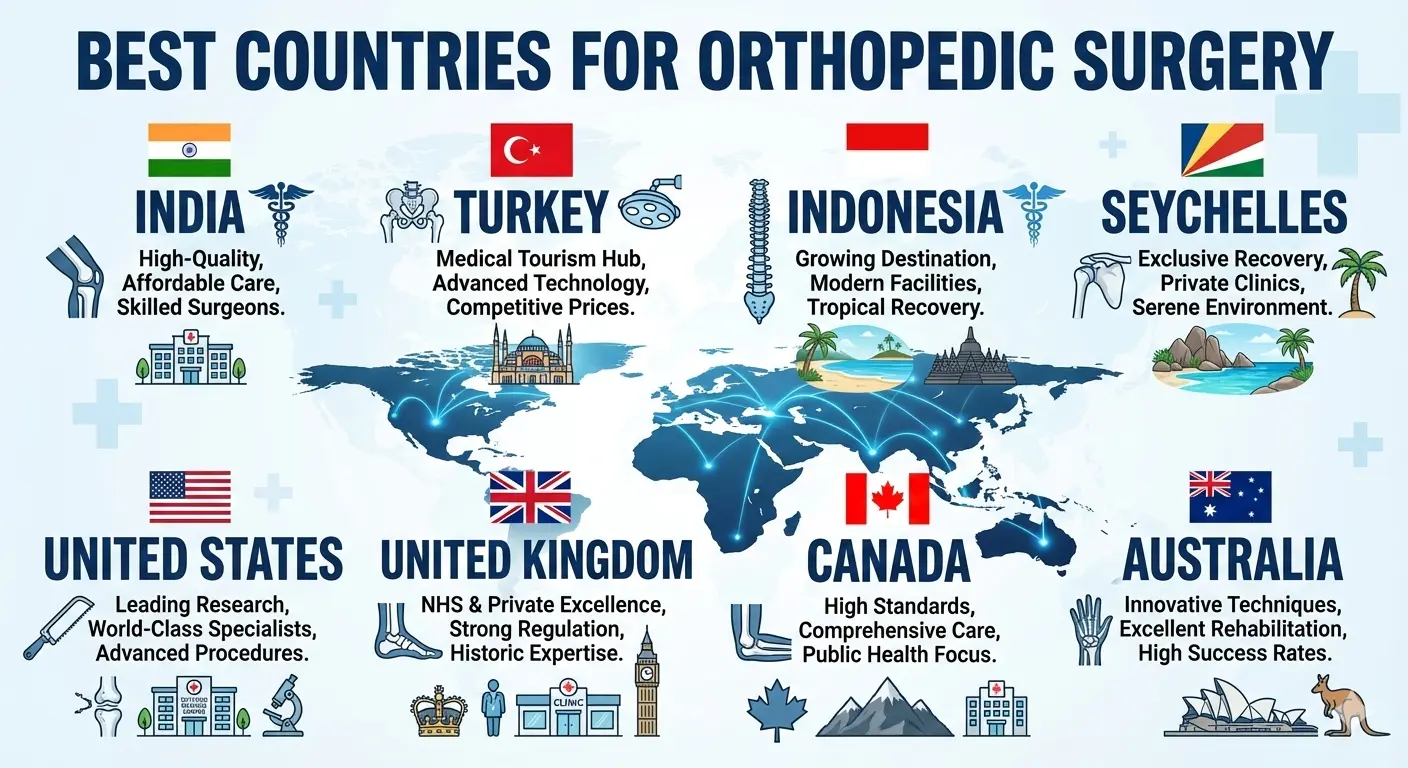 እንደ ህንድ፣ ታይላንድ፣ ቱርክ፣ ጀርመን እና ሜክሲኮ ያሉ አገሮች በአመቺ ዋጋቸው፣ ከፍተኛ ብቃት ባላቸው የቀዶ ጥገና ሐኪሞቻቸው እና ዓለም አቀፍ እውቅና ባላቸው ሆስፒታሎቻቸው ምክንያት ለአጥንት ሂደቶች ዋና ምርጫዎች ሆነዋል። ለምሳሌ፣ በአሜሪካ ውስጥ የዳሌ መተካት ቀዶ ጥገና ወደ $40,000 የሚጠጋ ሲሆን፣ ተመሳሳይ አሰራር በህንድ ውስጥ በግምት $7,000–$9,000 ያስከፍላል፣ ይህም ጥራትን ሳይጎዳ ከፍተኛ ቁጠባ ያቀርባል።