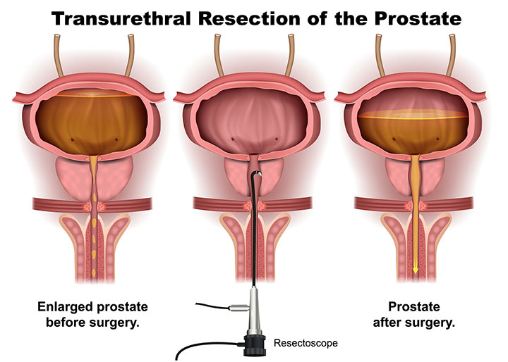 Transurethral Resection of the Prostate (TURP) is performed under general or spinal anesthesia. The urologist inserts a resectoscope – a thin, rigid tube with a light, camera, and a cutting tool – through the urethra into the bladder. Guided by the camera, the surgeon uses an electrical loop to carefully remove small pieces of the obstructing prostate tissue, widening the channel for urine flow. During the procedure, a sterile irrigating solution is continuously flushed through the bladder to wash away removed tissue fragments and keep the surgical field clear. Once enough tissue is removed, the resectoscope is withdrawn, and a catheter is inserted into the bladder to drain urine and continuously irrigate the bladder to prevent blood clots for a few days.